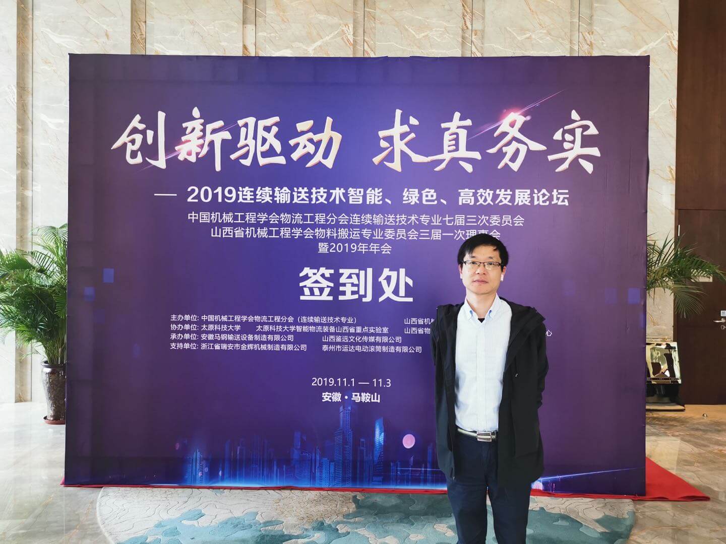 2019年11月1日我公司總經(jīng)理賈真參加了在馬鞍山舉行的中國機械工程學(xué)會(huì )物流工程分會(huì )連續輸送技術(shù)專(zhuān)業(yè)第七屆三次委員會(huì )暨2019年年會(huì )